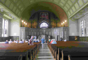 Nach einem kurzen Marsch durch die Winterthurer Altstadt war die Stadtkirche Winterthur unser letztes Ziel. Diese reformierte Kirche überraschte im Innern mit grossflächigen Malereien in satten Farben, dazu die imposante Barockorgel mit vergoldeten Schnitzereien. Was für ein Gegensatz! Simons Erläuterungen waren wiederum sehr hilfreich, die Orgel wurde von E.F. Walcker im Jahre 1887/88 erbaut und ist eine „Secondhand Orgel“ denn der Hauptteil des Gehäuses stammt aus dem Zisterzienserkloster Salem, erbaut 1768 durch Karl Joseph Riepp.