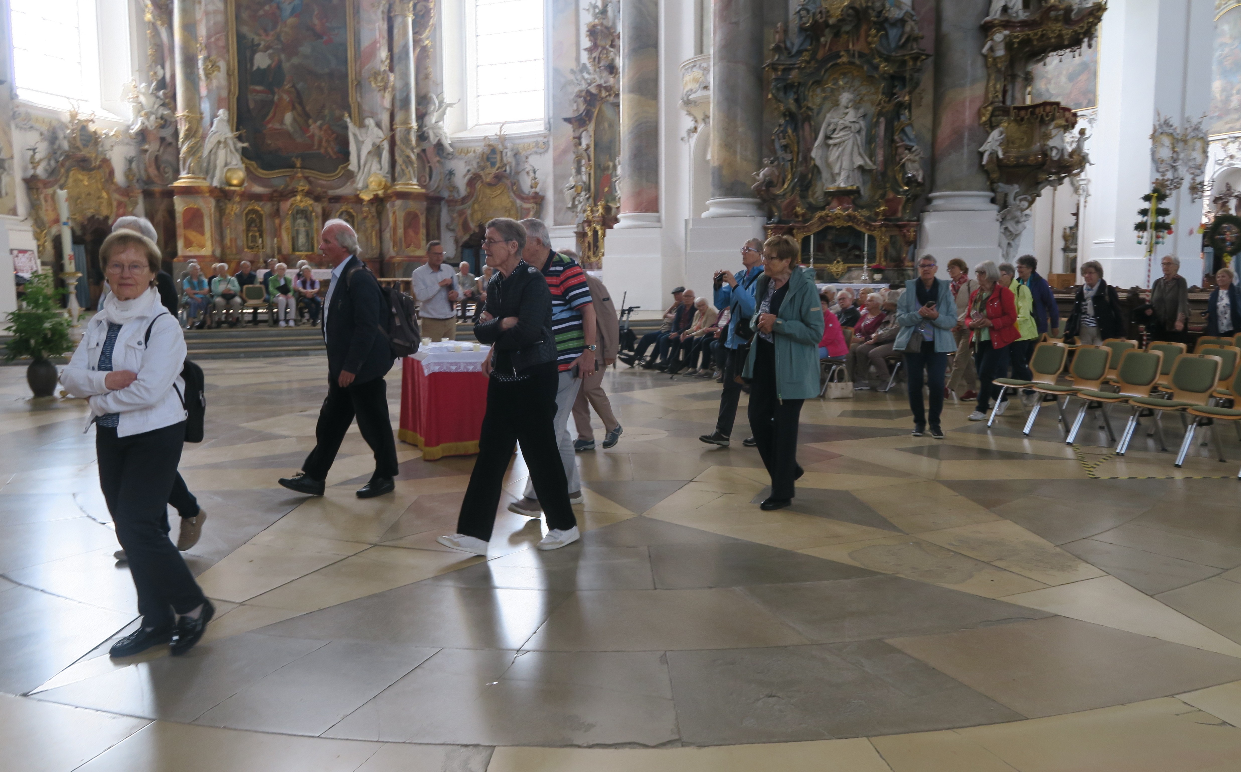 Beim Eintritt in die Kirche überkommt uns das Staunen und wir sind überwältigt von der Pracht und Ausstattung, die Kirche wird dem Spätbarock und Rokoko zugeordnet. Die Prämonstratenser – ein Priesterorden – hat dieses Wunderwerk in Auftrag gegeben, gebaut wurde von 1728 bis 1731 von den Gebrüdern Dominikus und Johann Zimmermann. Herzstück ist das gotische Gnadenbild von 1415. Viele bedeutende Künstler wurden beige-zogen. Schon bald entdecken wir auch die zahlreichen Tiere, die in Stuck gegossen und bemalt die Decke bevölkern. Wir verzichten aber auf das Nachzählen der 365 Engel… Bekannt ist die Kirche auch bei den Jakobspilgern, liegt sie doch auf der Strecke Nördlingen- Ulm und weiter Richtung Schweiz. Sie wird als schönste «Dorfkirche der Welt» bezeichnet.