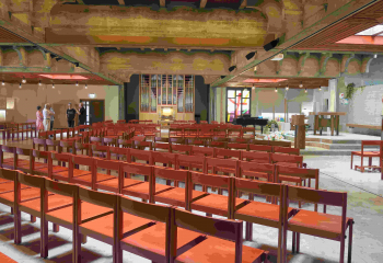 Die Kirche, schon von aussen eindrücklich, beeindruckte im Innern durch die besondere Gestaltung sowie Licht- und Farbgebung. Eindrücklich dazu die imposante Orgel, die den Chorraum überspannt. Simon Hebeisens Erklärungen waren sehr informativ, die Flawiler bewiesen Mut und Weitsicht als sie 1911 den berühmten Architekten Karl Moser für den Bau ihrer Kirche engagierten. Der Architekt bestimmte auch das Aussehen der Orgel, die Firma Goll führte den Orgelbau aus.